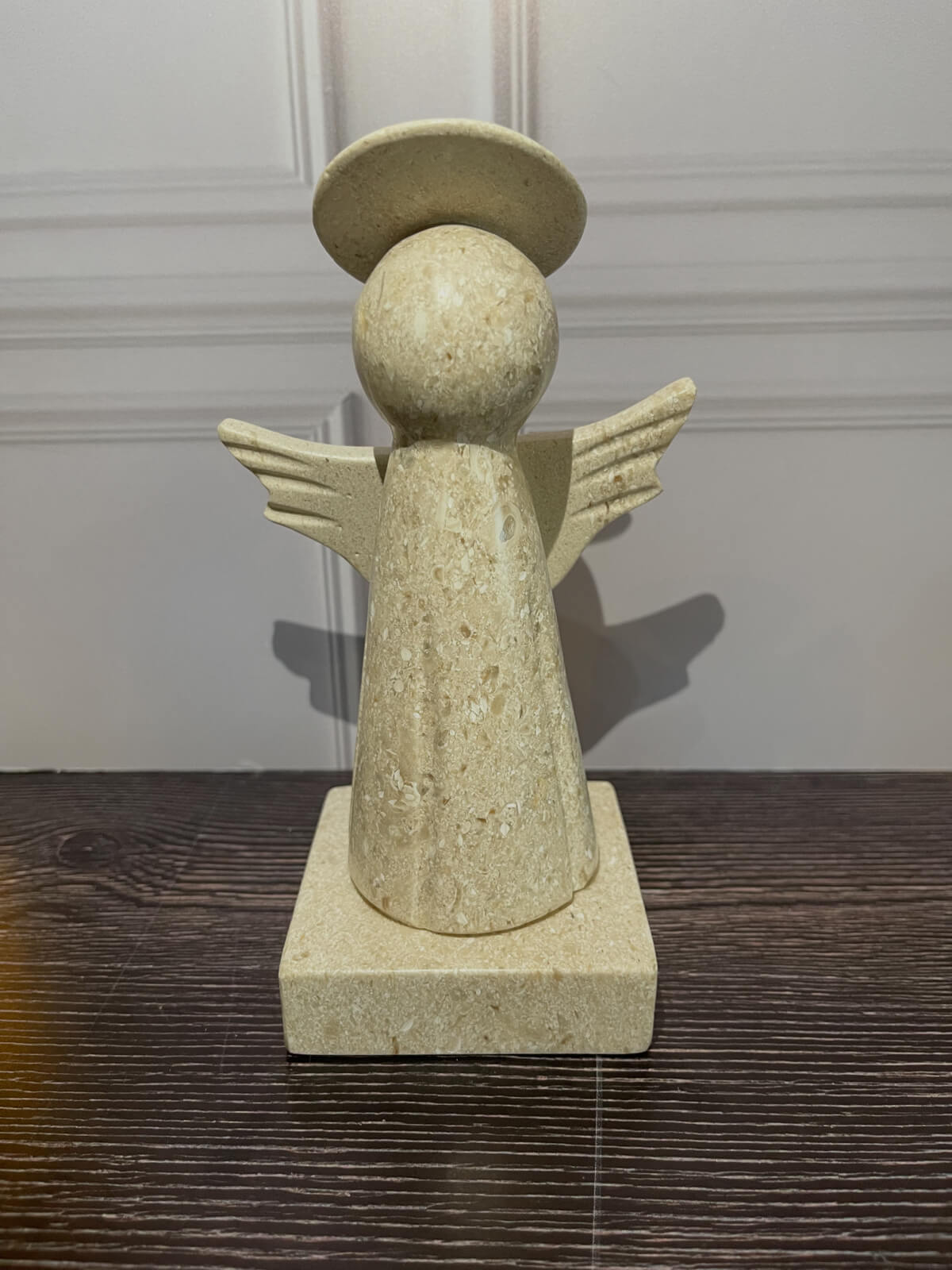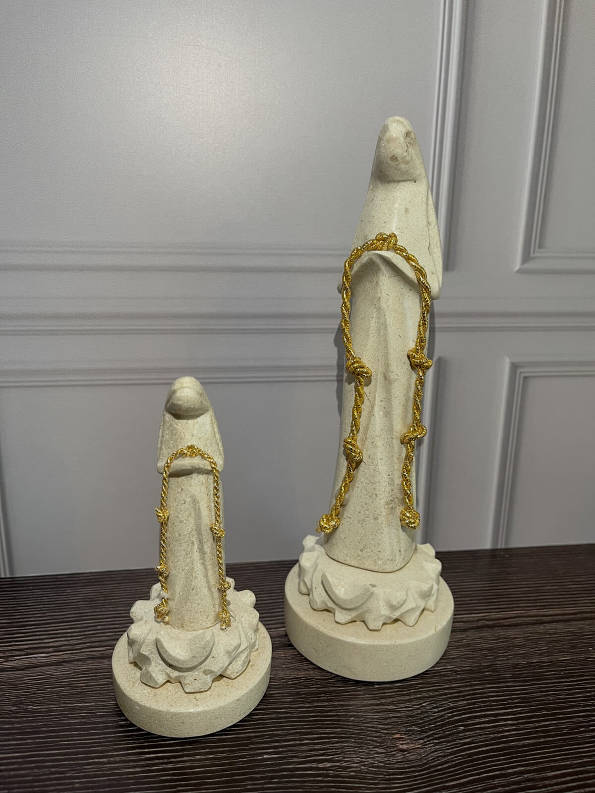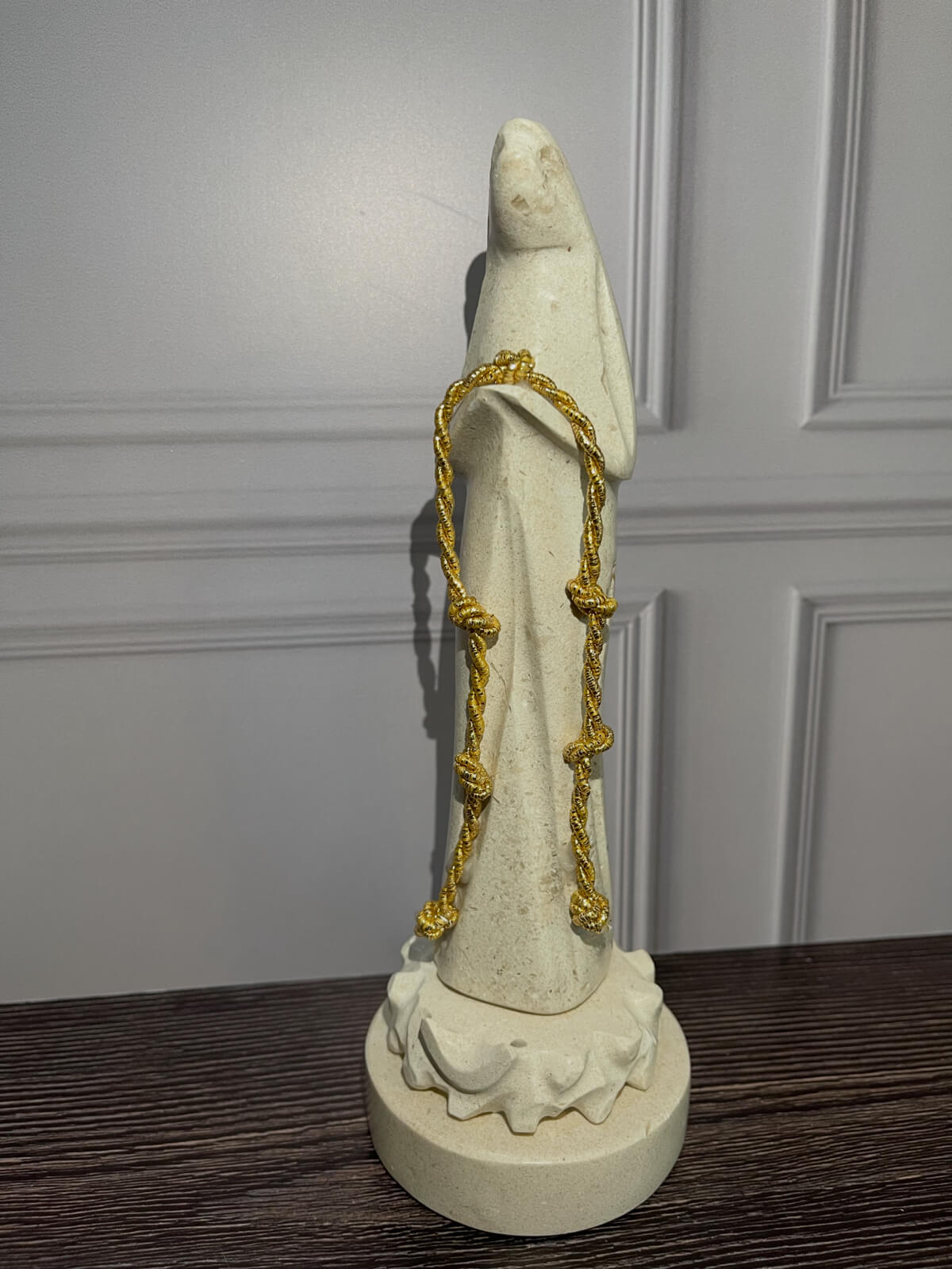 Figura de la Virgen Desatanudos, símbolo de fe, esperanza y confianza. Su diseño en mármol trasmite serenidad y armonía y el rosario dorado con nudos representa cada problema o preocupación que puede ser entregado con fe para encontrar su solución.